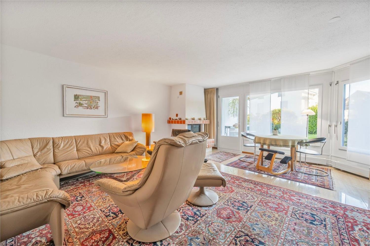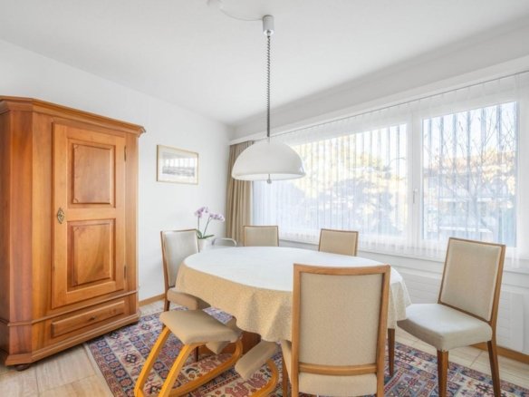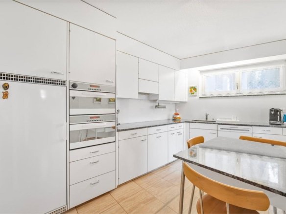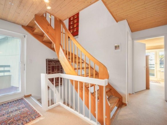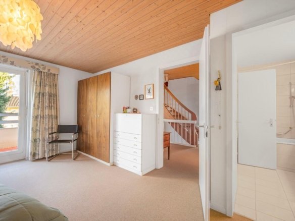 Im Erdgeschoss befinden sich das grosszügige Entrée, eine funktionale Küche sowie das helle Wohnzimmer mit Umluft-Cheminée und direktem Zugang zum Garten. Eine Nasszelle mit Dusche/WC ergänzt das Raumangebot.